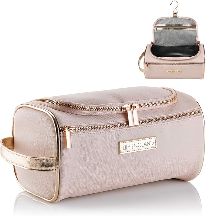 The Lily England Hanging Toiletry Bag is a stylish and practical travel essential for women who love elegance and organization. Designed in a beautiful pink and rose gold color, it features multiple compartments and an insulated waterproof lining to keep cosmetics, toiletries, and skincare items safe and cool while traveling.