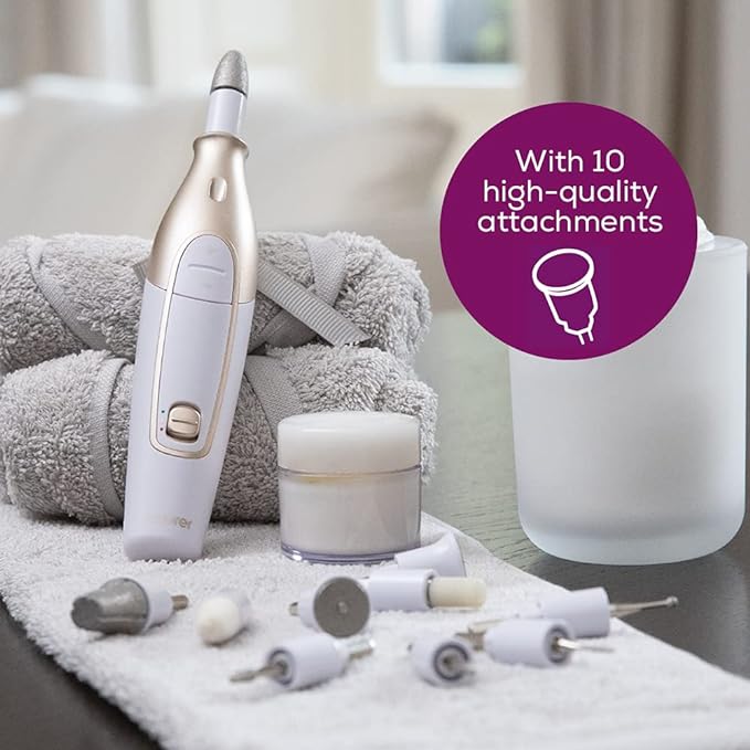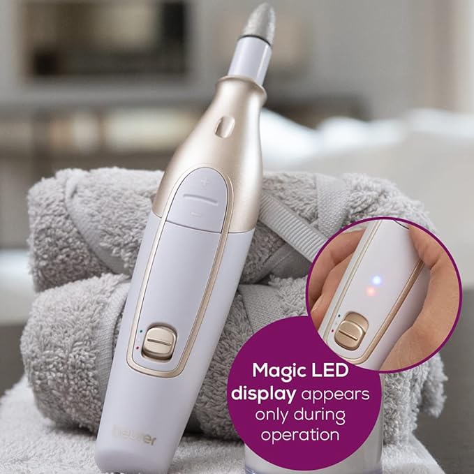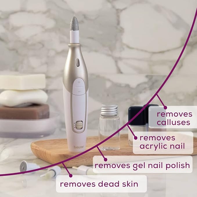 تتيح لك مجموعة مانيكير وباديكير اللاسلكية من بيورير MP64 تحقيق تصفيف احترافي للعناية بالأظافر في المنزل. مع 10 ملحقات من الياقوت واللباد عالية الجودة، يمكنك التغلب على كل التحديات في مجال العناية بالأظافر. يضمن ضوء LED الساطع أفضل رؤية ممكنة للمنطقة المراد علاجها، كما أن التصميم المريح لمبرد الأظافر الكهربائي يمنعه من الانزلاق أثناء العلاج. لمزيد من الراحة والمرونة، توفر بطارية الليثيوم أيون المدمجة عالية الأداء ما يصل إلى ساعتين من المعالجة اللاسلكية لأظافر اليدين والقدمين دون متاعب الكابلات. يمكن تخزين كل من الجهاز والملحقات بسهولة في حقيبة التخزين المتميزة المتضمنة. نصائح: عند برد الظفر، اعملي دائمًا من خارج الظفر باتجاه الطرف! هذه الأداة مخصصة فقط لعلاج اليدين (مانيكير) والقدمين (باديكير). حدد أحد الملحقات وادفعه على عمود دوران الأداة باستخدام ضغط بسيط. للإزالة: افصل الملحق والأداة في الاتجاه المحوري (مستقيم). ابدأ كل تطبيق بسرعة منخفضة وقم بزيادته فقط حسب الحاجة. لا تمارس ضغطًا شديدًا وقم دائمًا بتوجيه الملحقات بعناية على السطح المراد معالجته. لاحظ أن ملحقات القطع سيكون لها تأثير أقل إذا كان الجلد ناعمًا أو رطبًا. لا يُنصح باستخدامه مع أظافر الأكريليك والأظافر الهلامية.