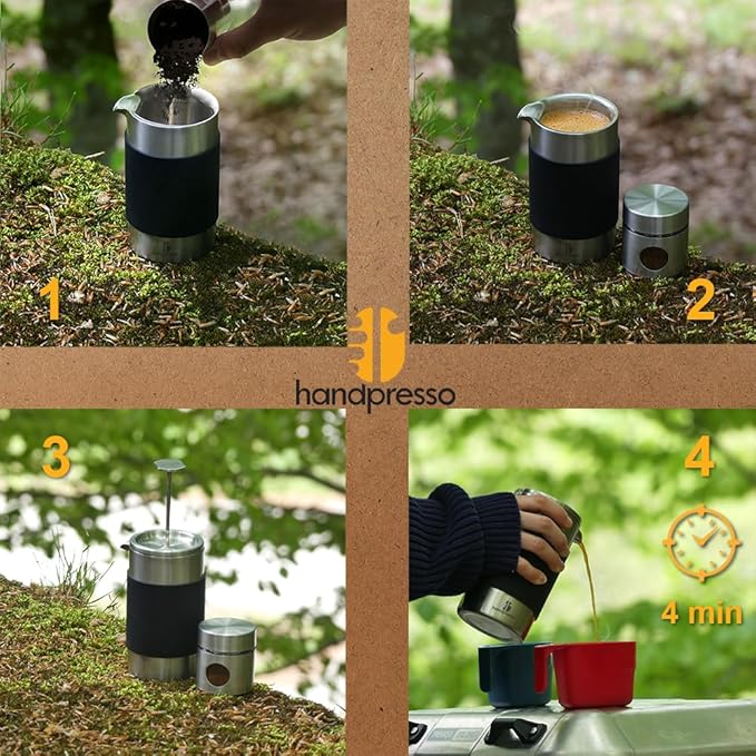 مكبس قهوة محمول للسفر من هاندبريسو، مكبس قهوة فرنسي مدمج (INOX) معزول بجدار مزدوج، 0.35 لتر (3 أكواب)، مجموعة ماكينة قهوة صغيرة محمولة للسفر مع حقيبة حمل، صندوق قهوة مطحونة