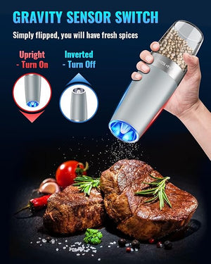 مجموعة مطحنة الفلفل والملح الكهربائية من Sweet Alice Gravity، درجة خشونة قابلة للتعديل، تعمل بالبطارية مع إضاءة LED، تشغيل تلقائي بيد واحدة، رمادي فاتح، قطعتان