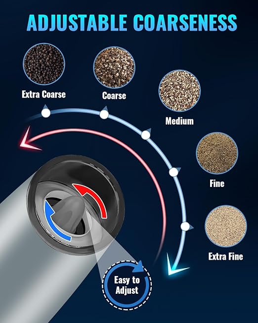 - مطحنة قابلة للتعديل تتيح لك مستويات الطحن المتعددة حسب اختيارك طحن التوابل من الخشن إلى الناعم. تستخدم مطحنة الفلفل والملح الكهربائية دوارًا سيراميكيًا عالي الجودة. يمكنك اختيار درجة خشونة التوابل أو الملح أو الفلفل عن طريق تدوير مقبض الضبط الموجود في رأس المطحنة.