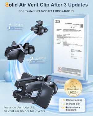 50 lbs suction cup (vacuum button) + military grade material + silicone panel. Dashboard/Windshield/Air Vent/Table (Desk) Dashboard/Dashboard/Car Mount, super sticky suction cup and clip in the latest design, protect your phone from scratches and bumps, stable use on smooth and bumpy roads.