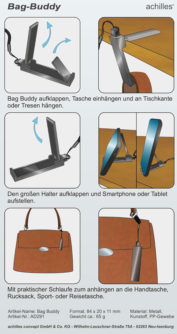 The Achilles Metal Bag Holder & Smartphone Stand is a sleek and multifunctional accessory designed for modern convenience. Made from durable, high-quality metal, this compact tool acts as both a bag hanger and a smartphone stand, making it perfect for on-the-go use. Attach it to a table edge to keep your handbag, backpack, or purse off the floor, or unfold it into a sturdy stand for your phone or tablet.